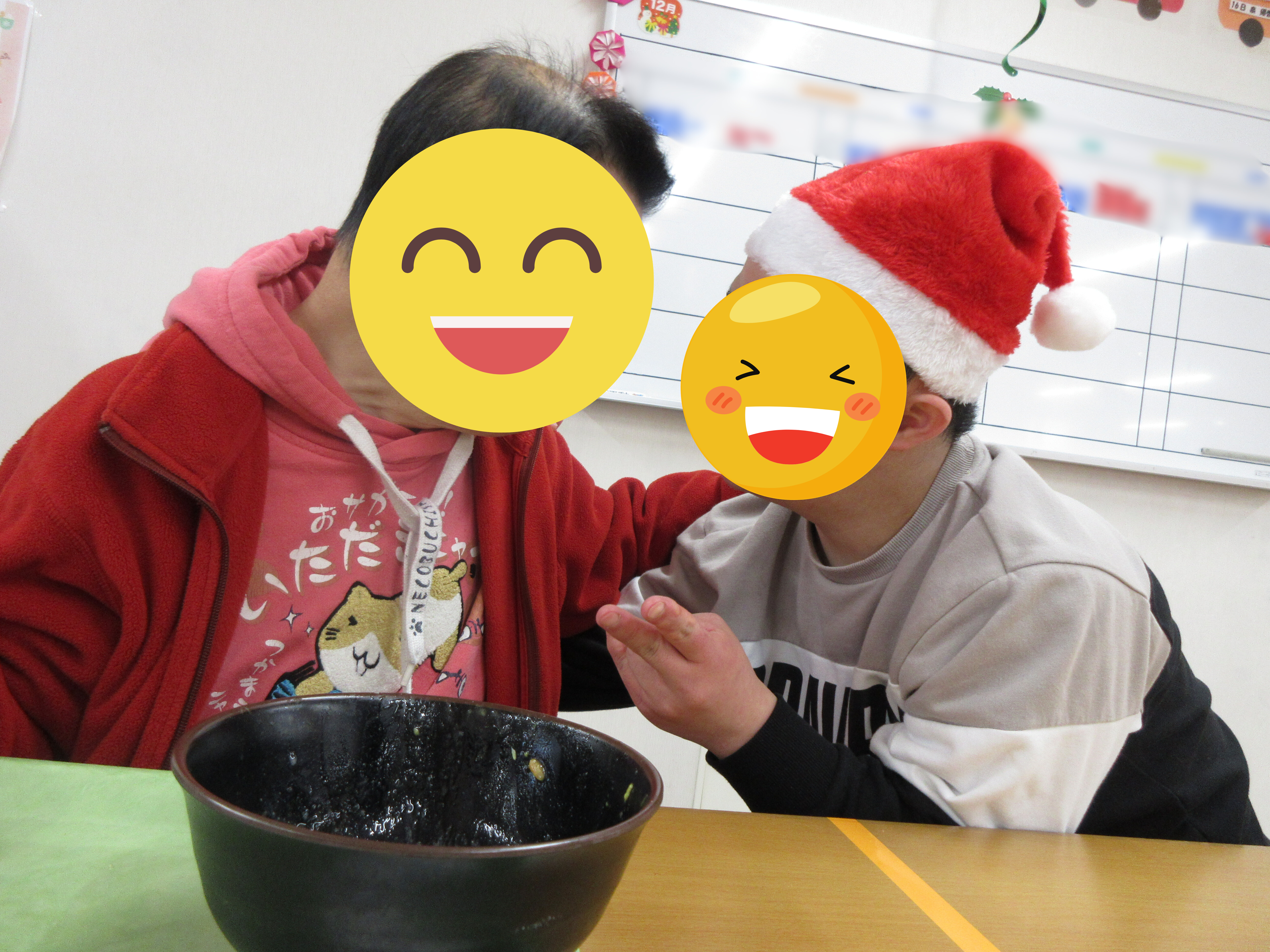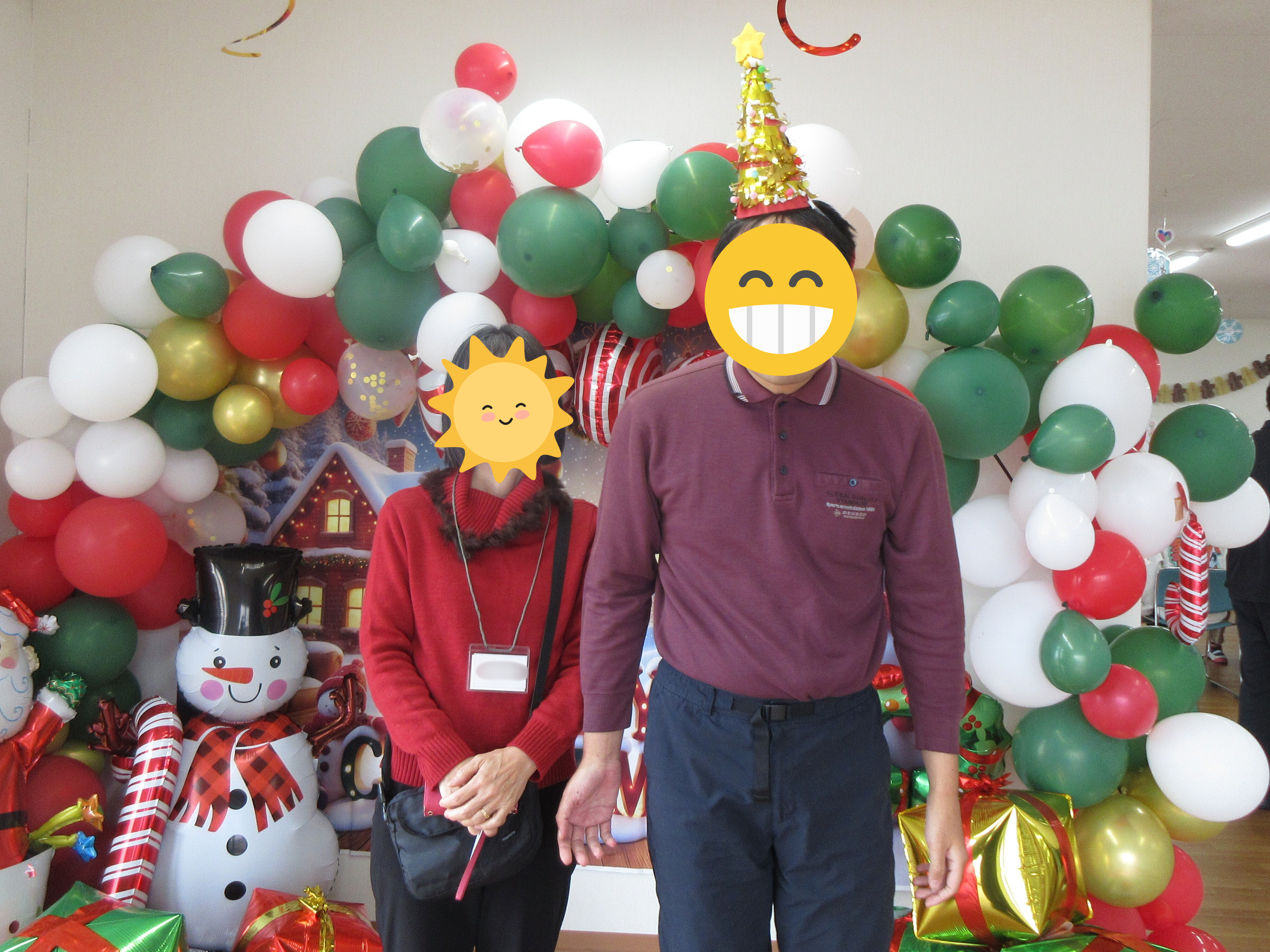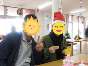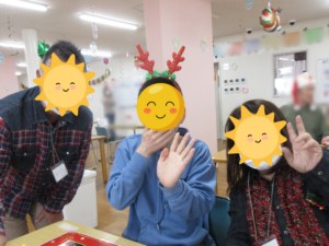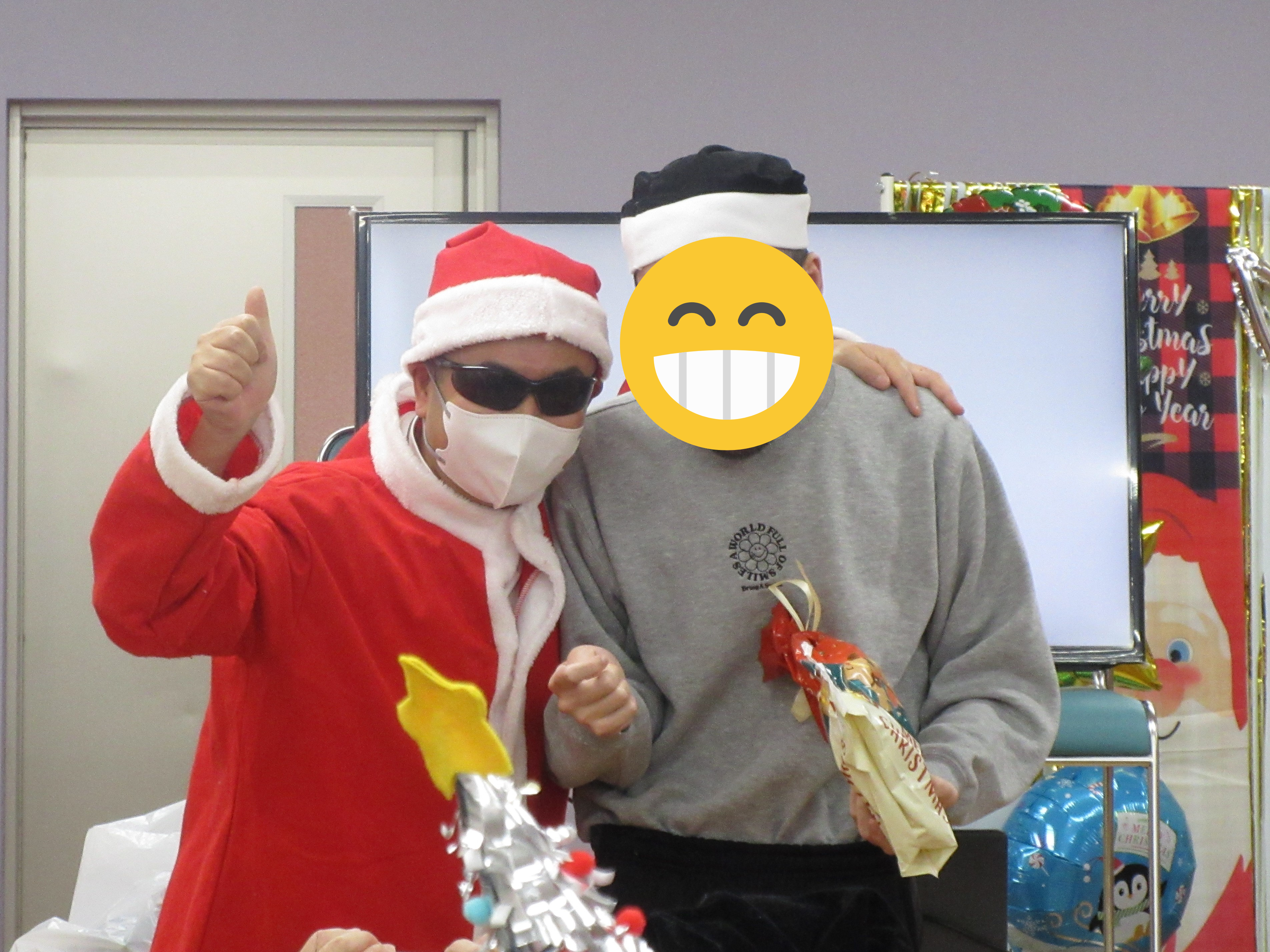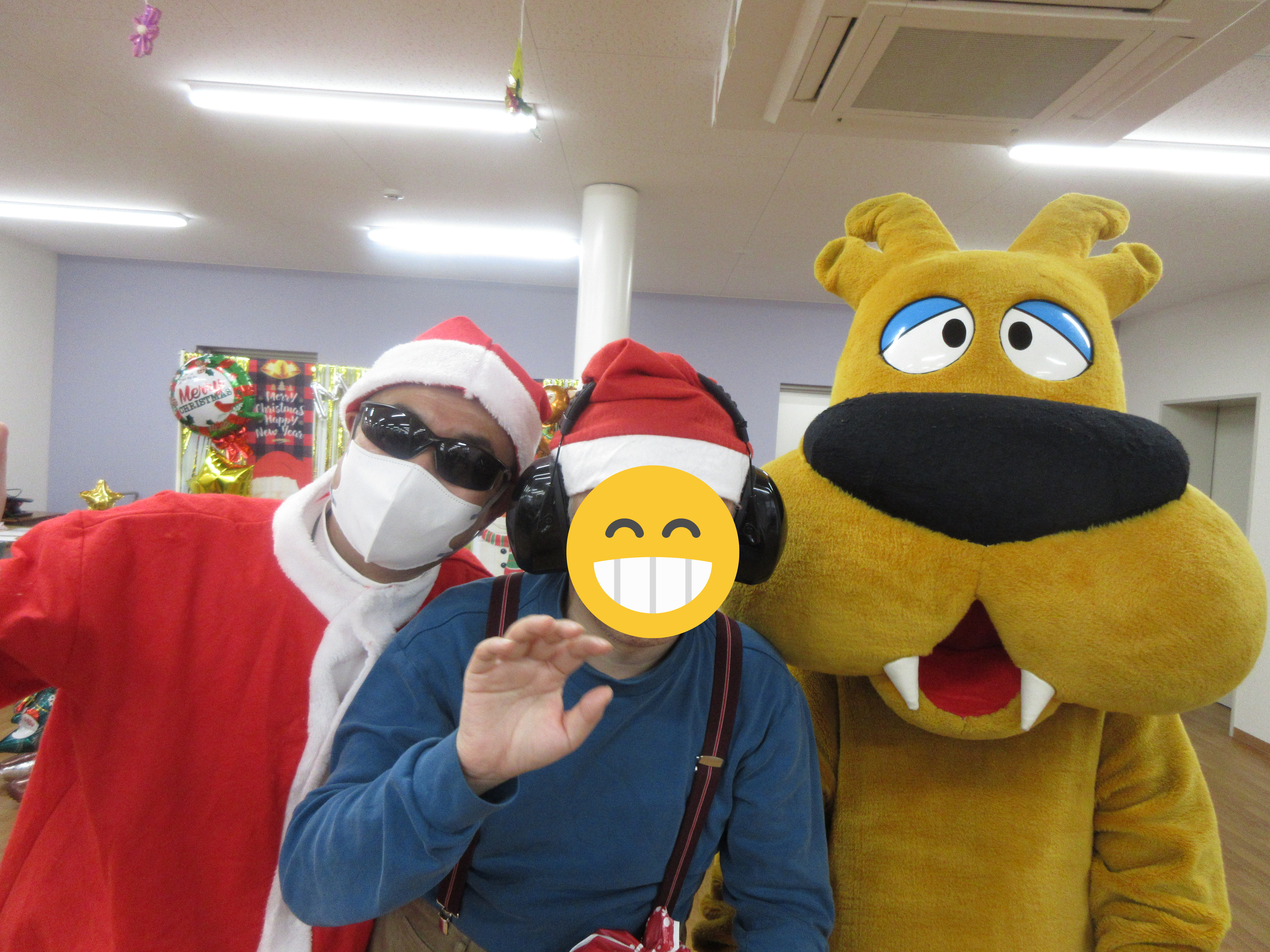仲良しの利用者様や職員、サンタやトナカイに囲まれて、ニコニコの笑顔でした💕
